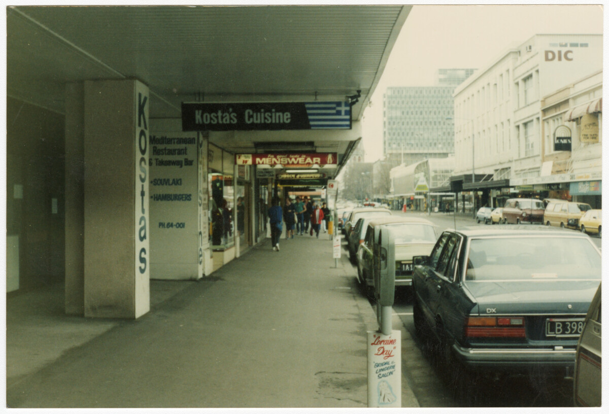 Exterior of Kosta's Cuisine on Colombo Street in the Arthur Barnett Building. Taken looking north towards the Triangle Centre (far right) at the intersection with Cashel Street.