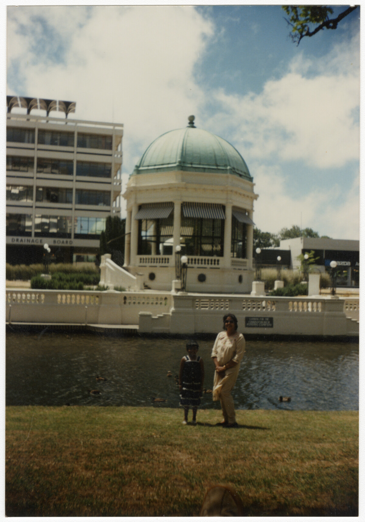 Members of the Gopal family outside the Thomas Edmonds Band Rotunda Restaurant along the banks of the Avon River near the intersection of Oxford Terrace and Manchester Street.