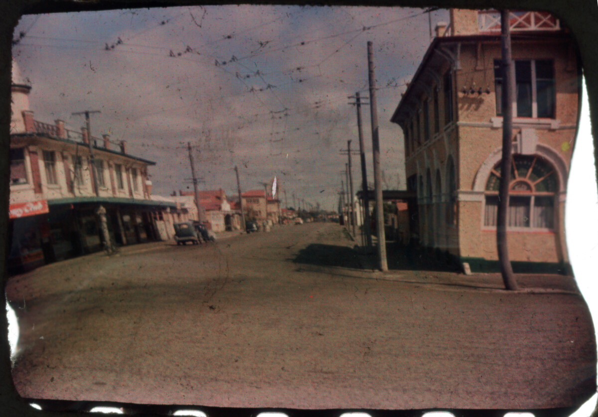 View down Bowhill Road from the corner with Marine Parade in New Brighton. Overhead are wires for the trolley buses.