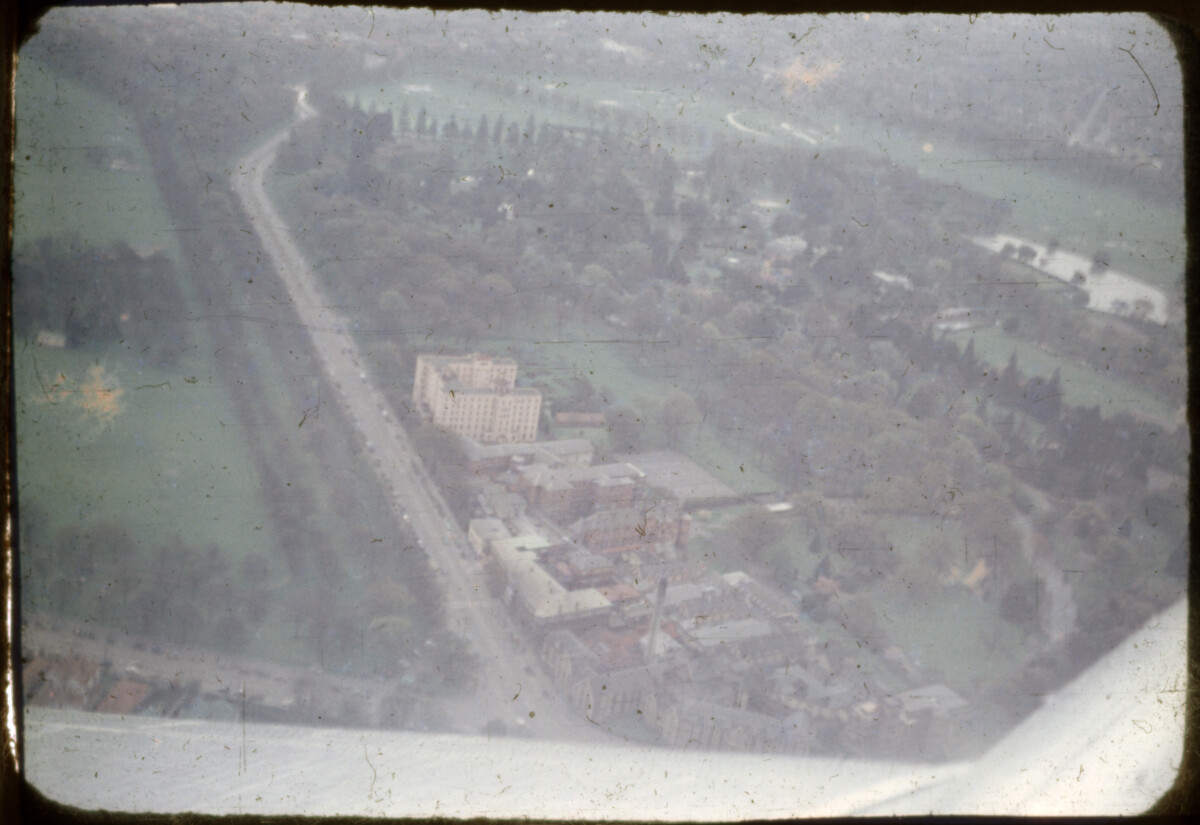 View taken during a flight over Christchurch Hospital along Riccarton Avenue, with the intersection with Hagley Avenue at the bottom centre.