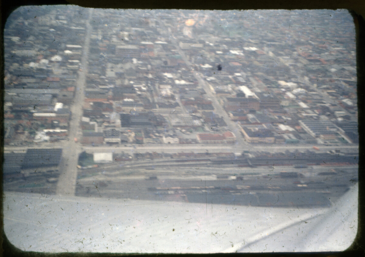 View taken from an aeroplane along Moorhouse Avenue near the railway tracks. Colombo Street is to the left with the railway station and the intersection with Manchester Street in the centre.