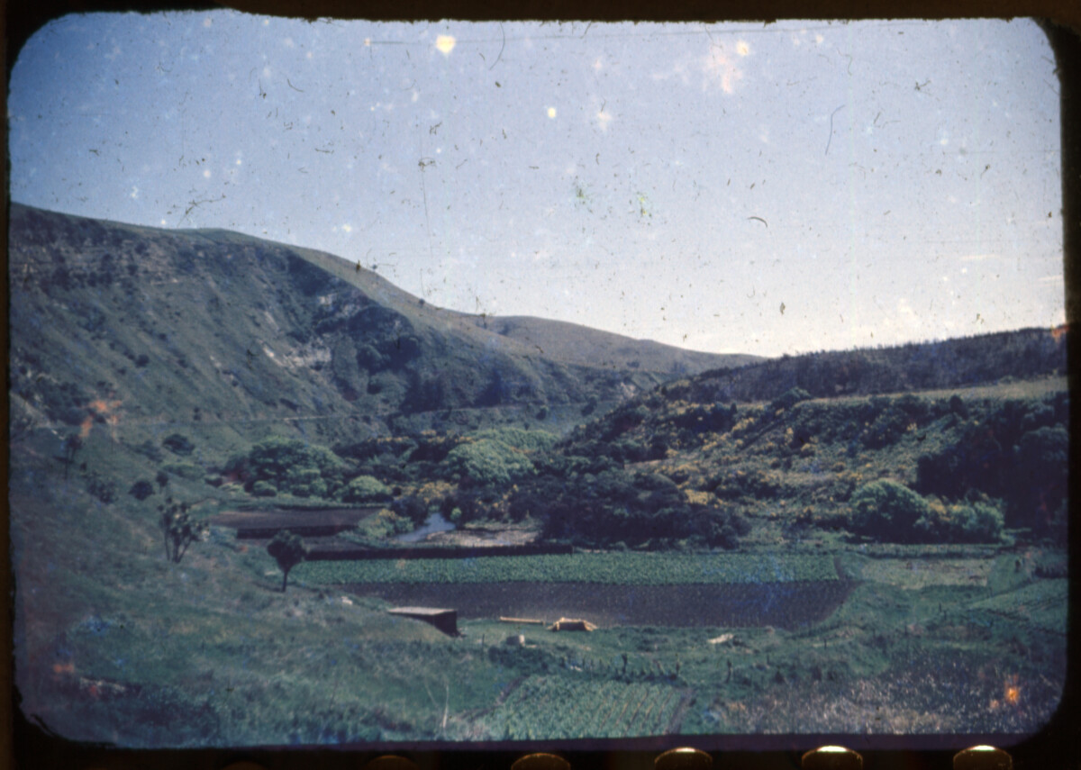 Nancy Kerr identified the location . The photo was taken from the access road into Gore Bay, near Cheviot . There was a market garden on the lower slopes, run by a family . Nancy remembered their surname . Nancy is the sister of John Abernethy. The Abernethy siblings grew up in Cheviot, and it remained the family base until 1961.