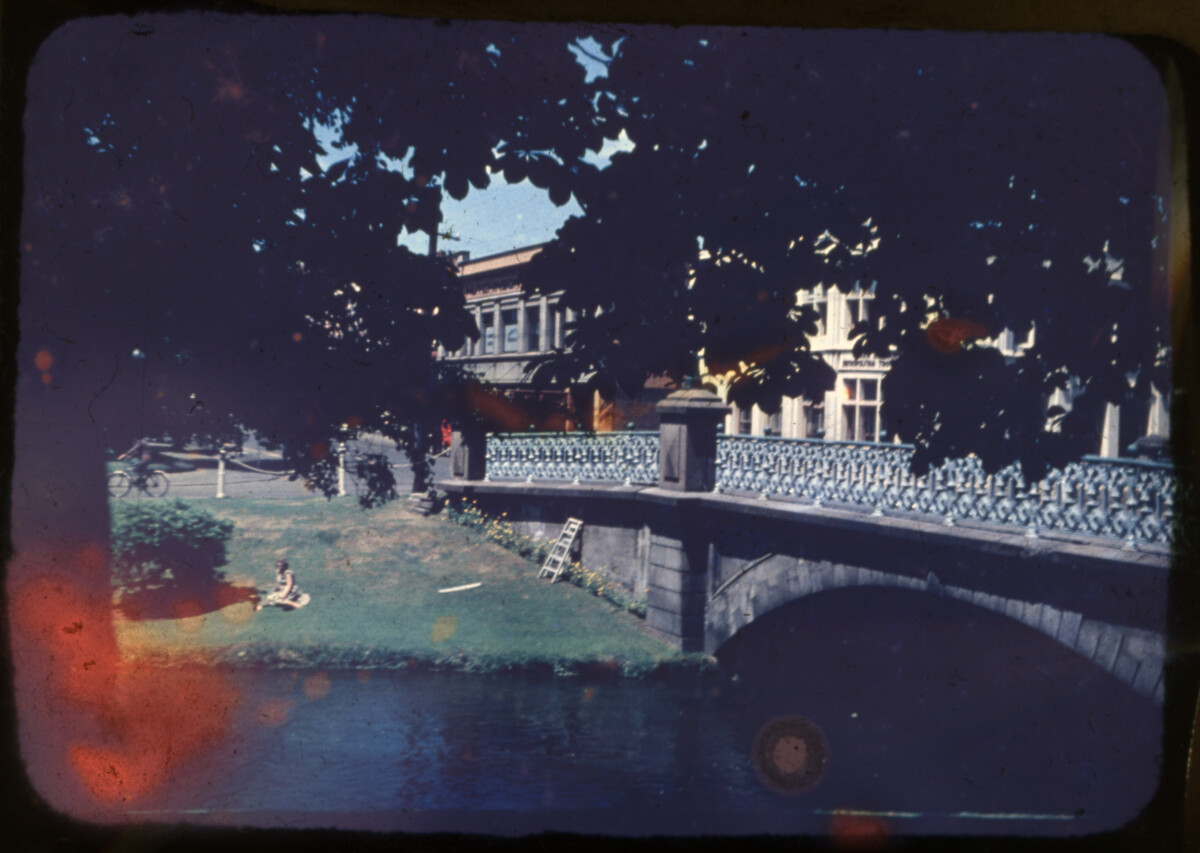 View of a woman seated on the bank of the Avon River next to the Armagh Street bridge with Armagh Street in the background and Victoria Square to the left.