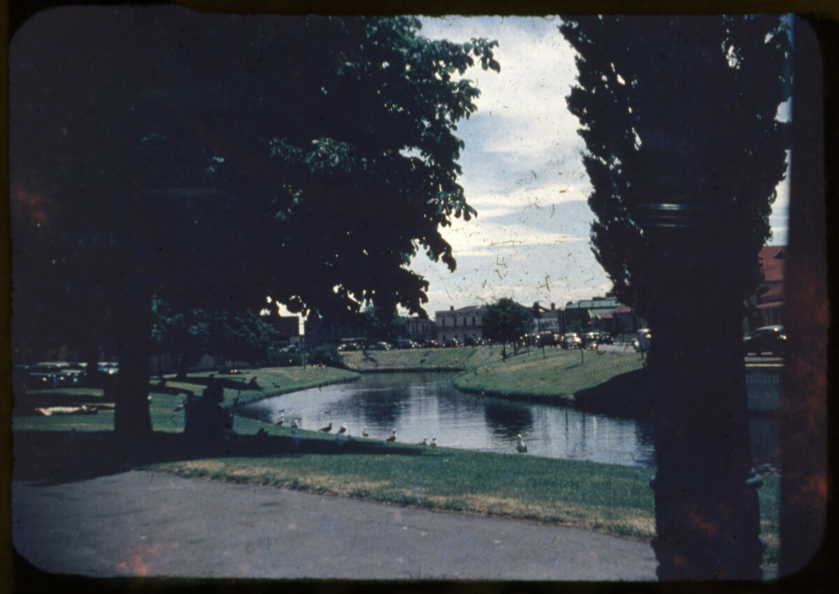 View looking along the Avon River with Cambridge Terrace to the right and Oxford Terrace to the left. Taken just past the Thomas Edmonds Band Rotunda.