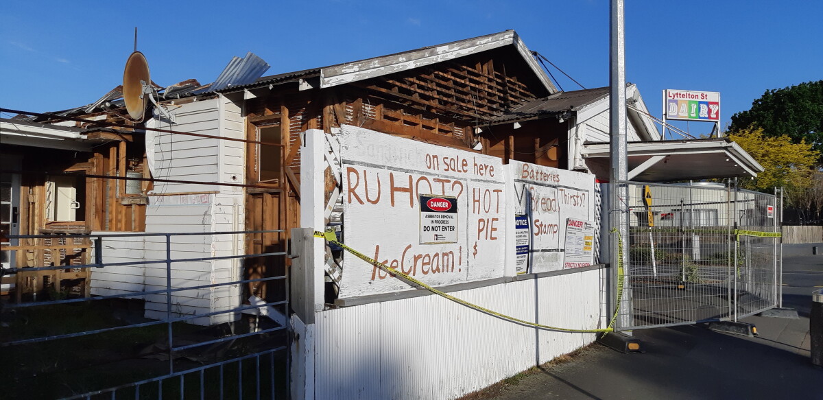 Side view of the Lyttelton Street Dairy during the first stages of asbestos removal and demolition works to the dairy and adjoining house. Taken from the Lyttelton Street side looking towards the intersection with Stourbridge Street in Spreydon.