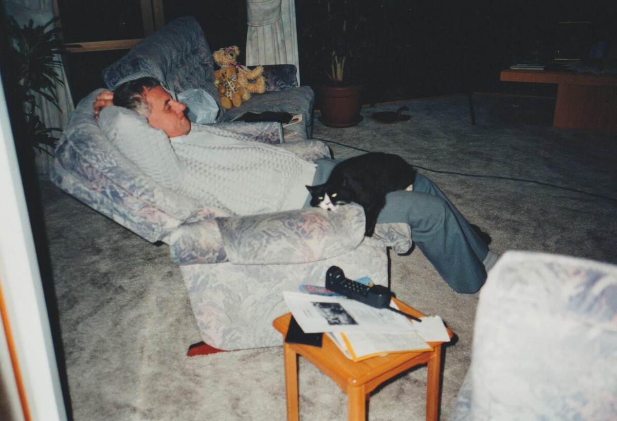 "Here is my husband David Gibson, relaxing in the lounge with our pet cat Snoopy." - Contributor's note