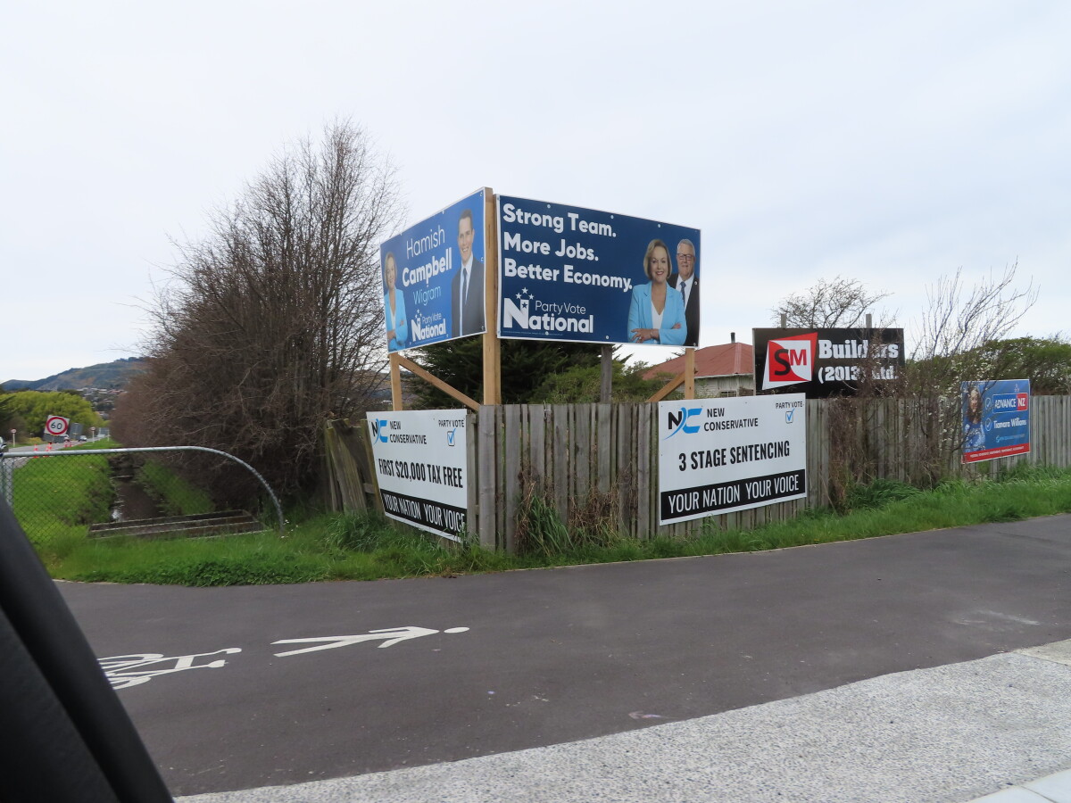 "Seen on the Quarryman's Trail cycleway. New Conservative, National and Advance New Zealand Party billboards on the corner of Sparks Road and Hendersons Road in Hoon Hay." - Contributor's note