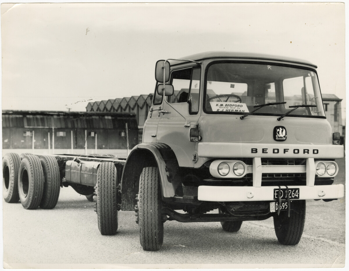 A new Bedford chassis and cab at the Addington Show Grounds with Canterbury Court in the background.