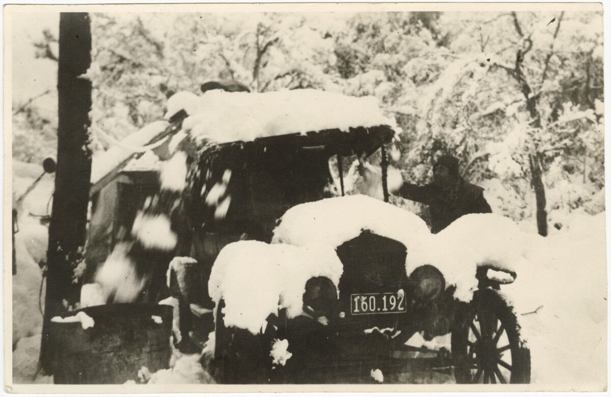 A Model T Tourer covered in snow at Coopers Creek in Rangiora.