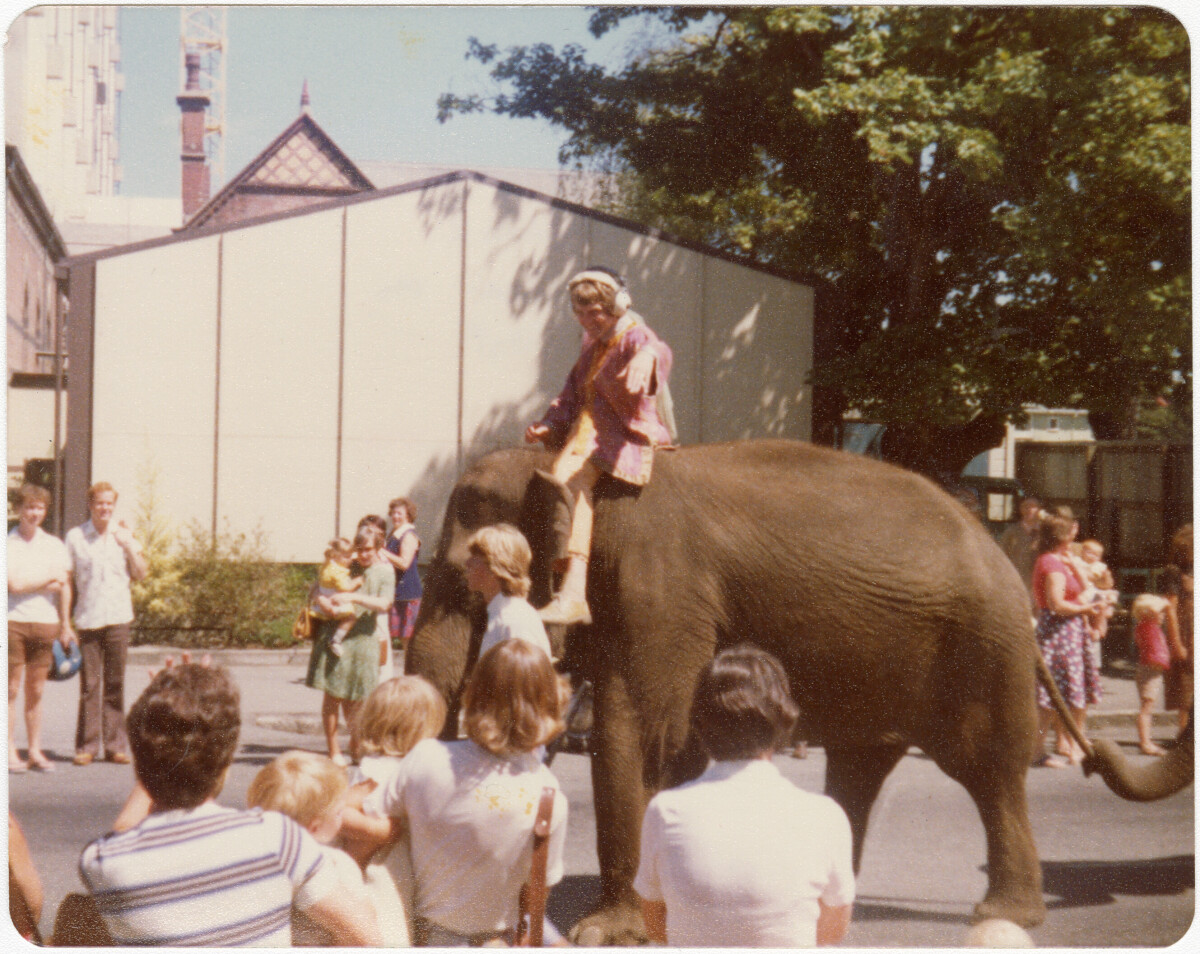 "Peter Williams, then 3ZB radio announcer, later TV personality, riding an elephant during a circus parade in Cambridge Terrace with old public library building in the background on 1st Feb 1979." - Contributor's note