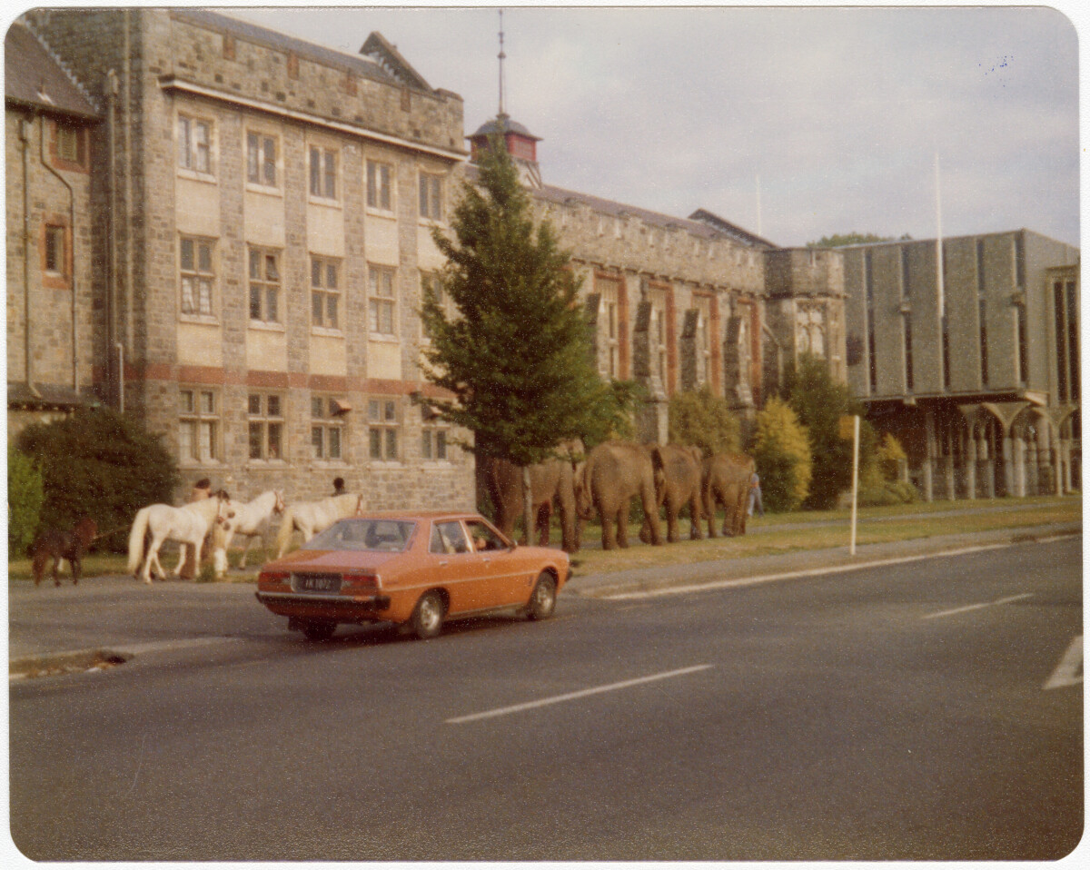 "Elephants and horses from a visiting circus being exercised, Rolleston Avenue, Chch, outside Christs College, 30th January 1979." - Contributor's note.