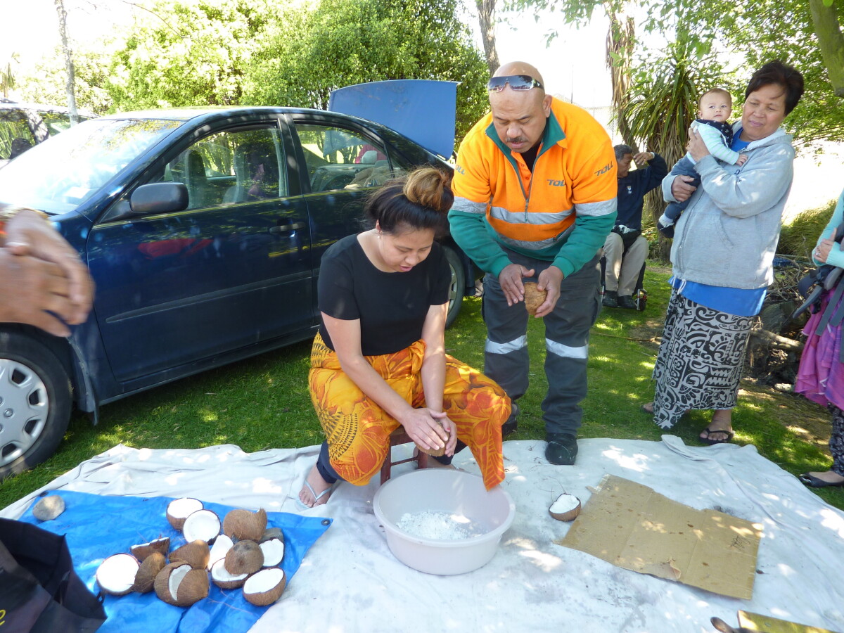 Matala coconut scraping at the Family day for Aiga Mulitalo. This was held at the Ekalesia Faapotopotoga Kerisiano Samoa (EFKS church) to prepare and cook an Umu.