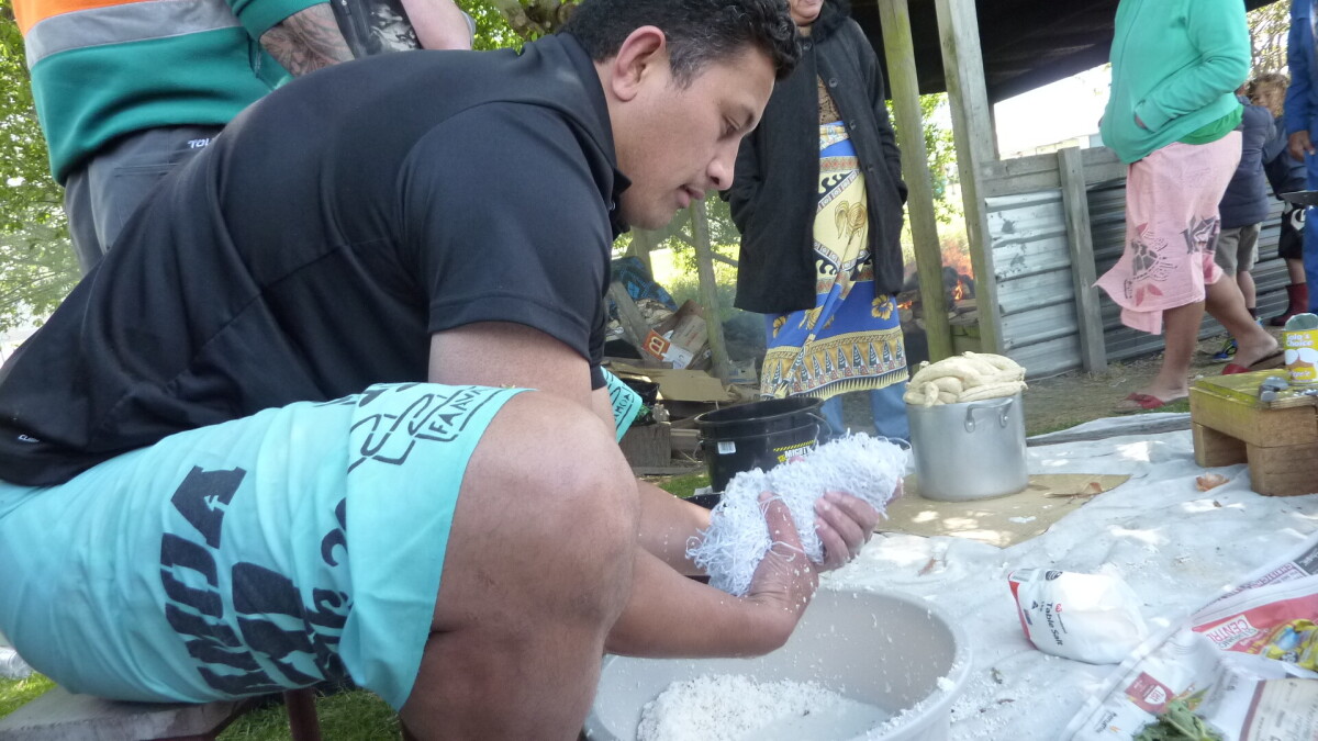 Enoka making coconut cream at the Family day for Aiga Mulitalo. This was held at the Ekalesia Faapotopotoga Kerisiano Samoa (EFKS church) to prepare and cook an Umu.