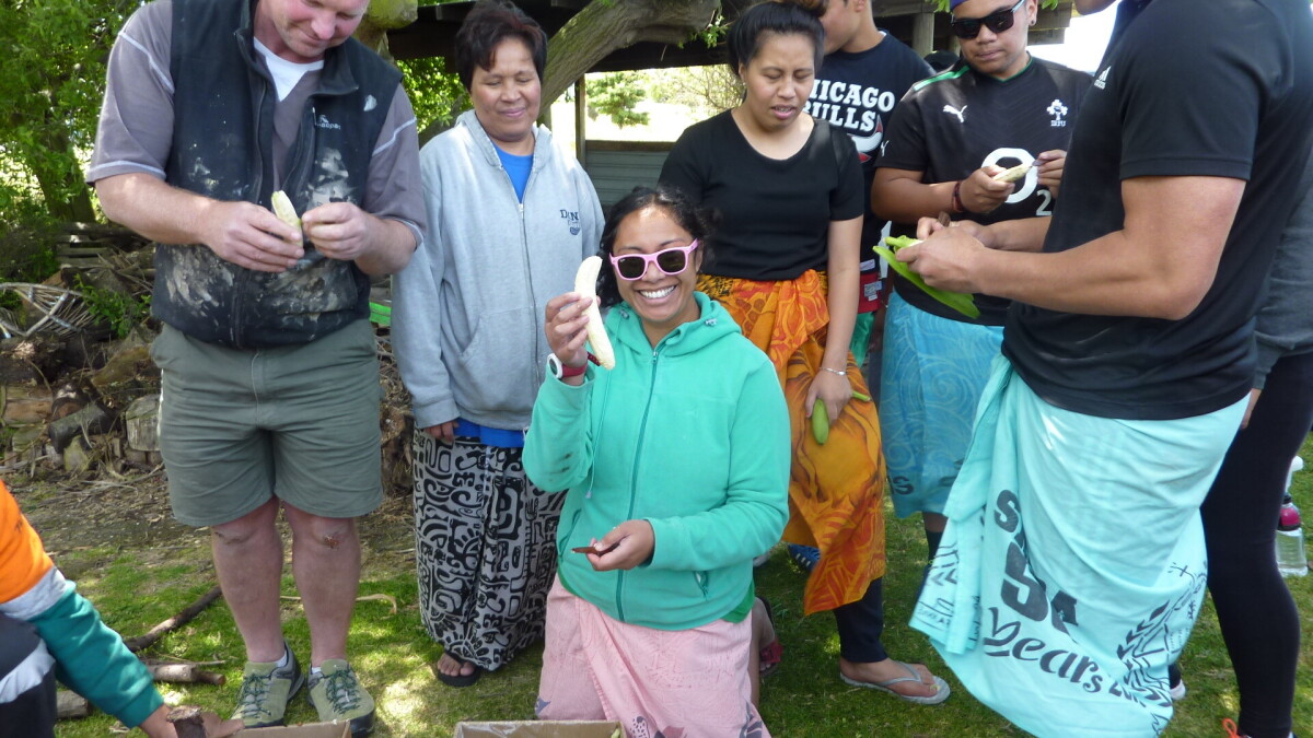 We did it, peeled the Green banana with a stick! At the Family day for Aiga Mulitalo which was held at the Ekalesia Faapotopotoga Kerisiano Samoa (EFKS church) to prepare and cook an Umu.