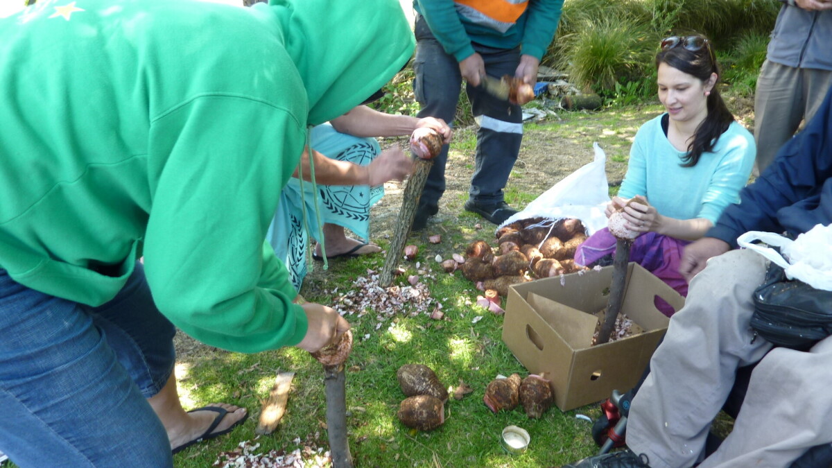 Everyone preparing Taro at the Family day for Aiga Mulitalo. This was held at the Ekalesia Faapotopotoga Kerisiano Samoa (EFKS church) to prepare and cook an Umu.