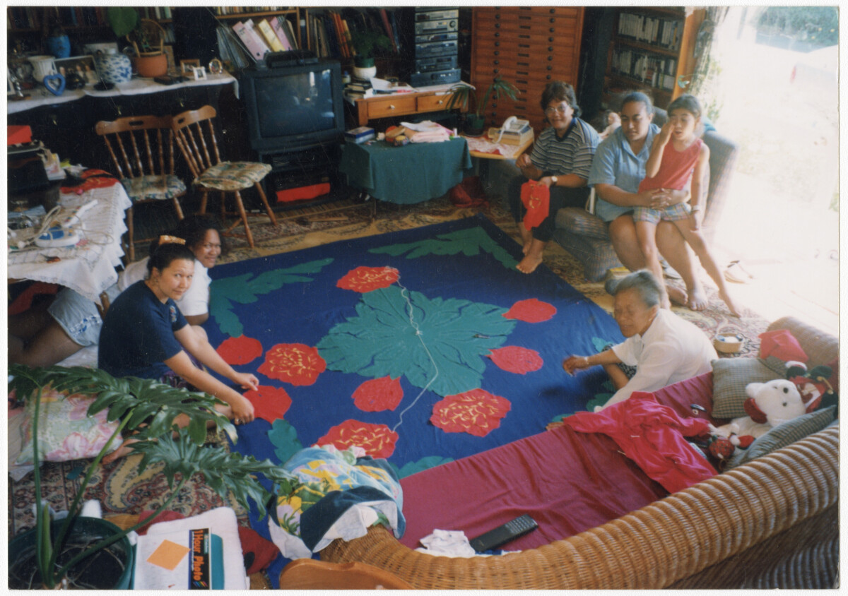 Working together in a lounge in Matheson Road to sew a Tivaevae for Deborah (Puretu Tangiiataua’s daughter) and her husband Spencer Cox. Left clockwise: Michelle Oberg, her cousin Tauta’i Tanigiiataua, Tau’s mother Puretu Tangiiataua and sister Rangi, Francie (Michelle's daughter) and Rangi (Moeroa) Oberg.