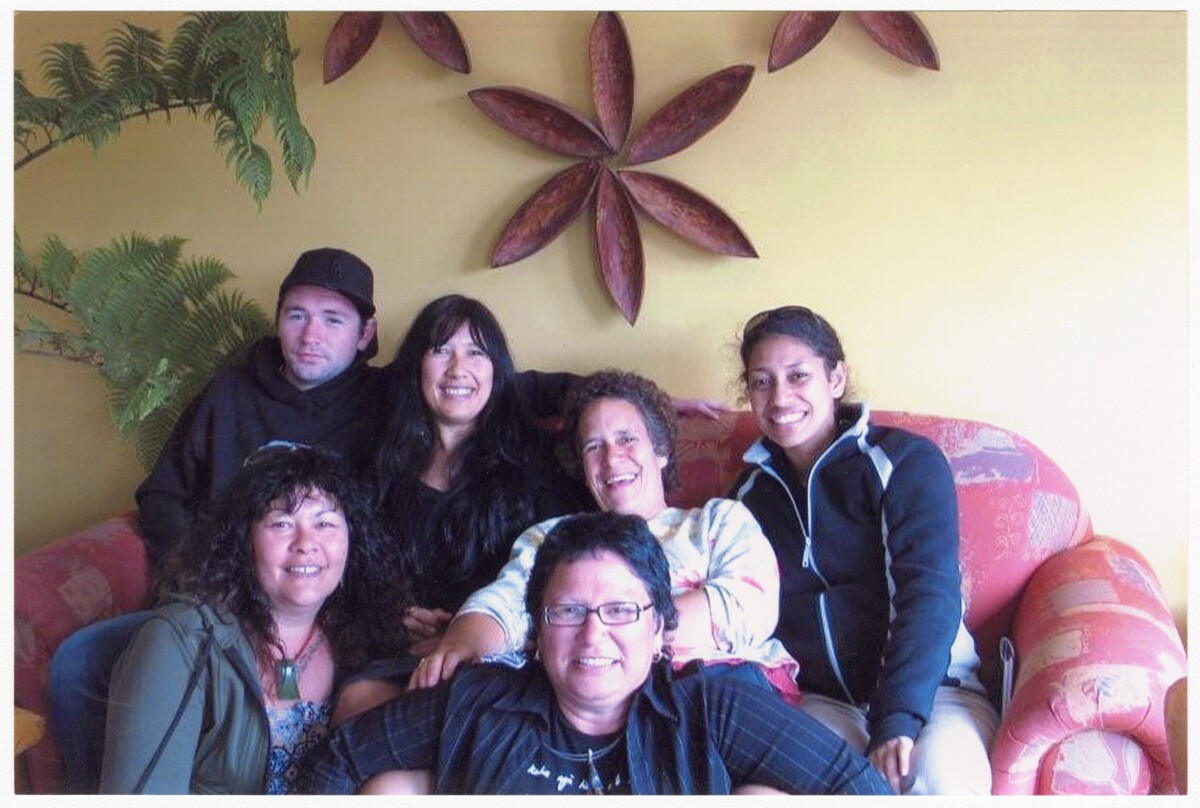 Photo taken at Karen Stevenson’s under an art-work by Lonnie Hutchinson. Karen Stevenson taught the first tertiary course in Pacific Art History in New Zealand at Canterbury University and hosted the 2001 Pacific Arts Association International conference to Christchurch. Left back: Lee Wallace, Stephanie Oberg, Dr Karen Stevenson, Dr Katerina Teaiwa, lower : Lonnie Hutchinson, Trish Shaw.