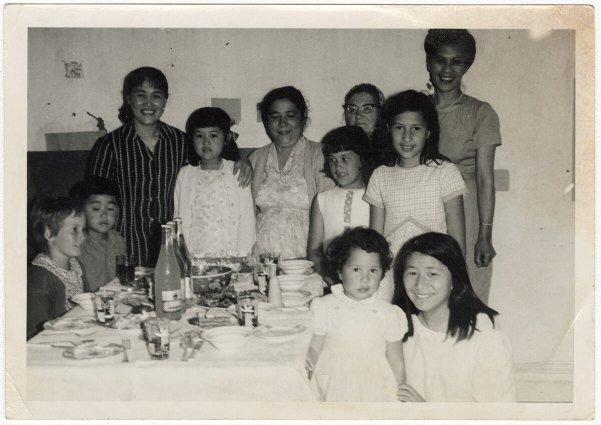 Shirley’s 8th birthday at the corner of Cross Street and Mathesons Road. Left to front right: Loraine Hopkins, Tomyu Hu, Han Wan Hu and her daughter Shirley Hu, Mrs Wang, Frances and Stephanie Oberg, behind them Mrs Wangs mother then Rangi Oberg, and in front Michelle Oberg and Lily Wang. Extended family in Phillipstown.