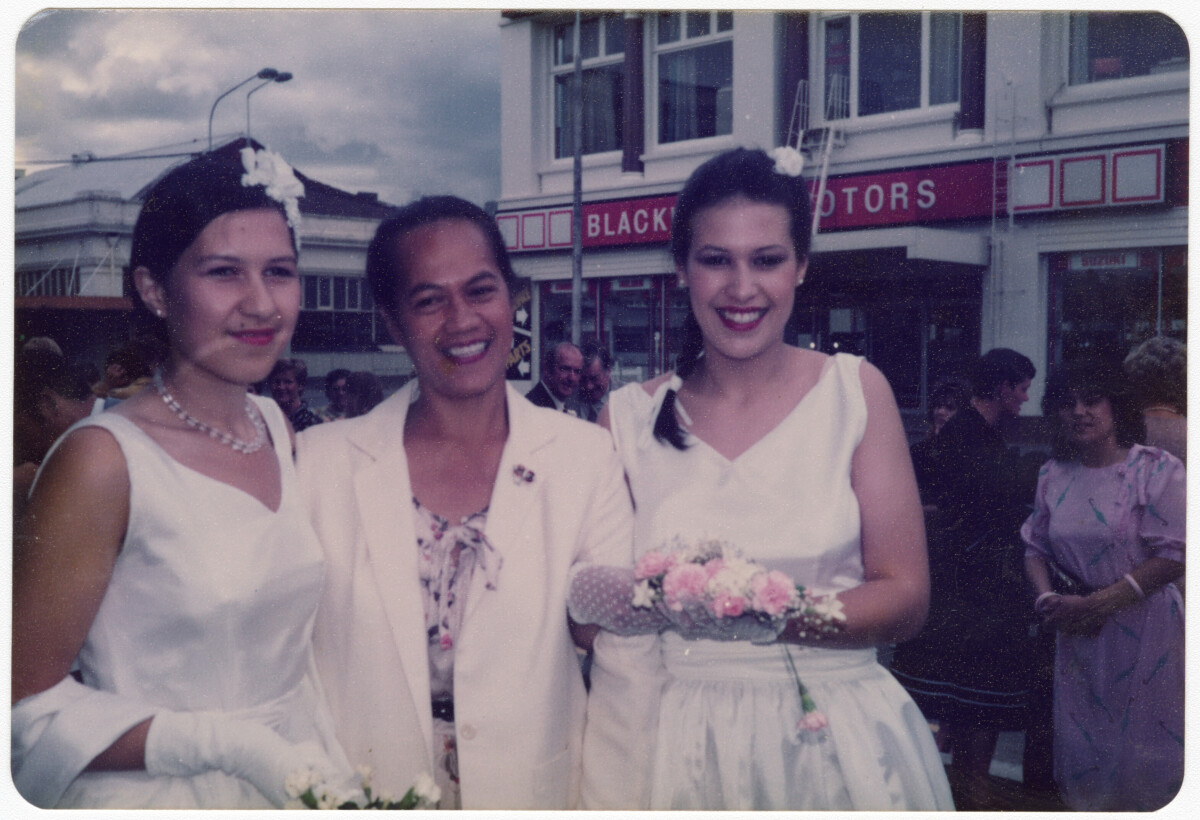 Wedding photo outside St Pauls Presbyterian Church in Cashel Street. From the left, the Bride- Stephanie Oberg, her aunty Puretu and sister Frances Oberg.