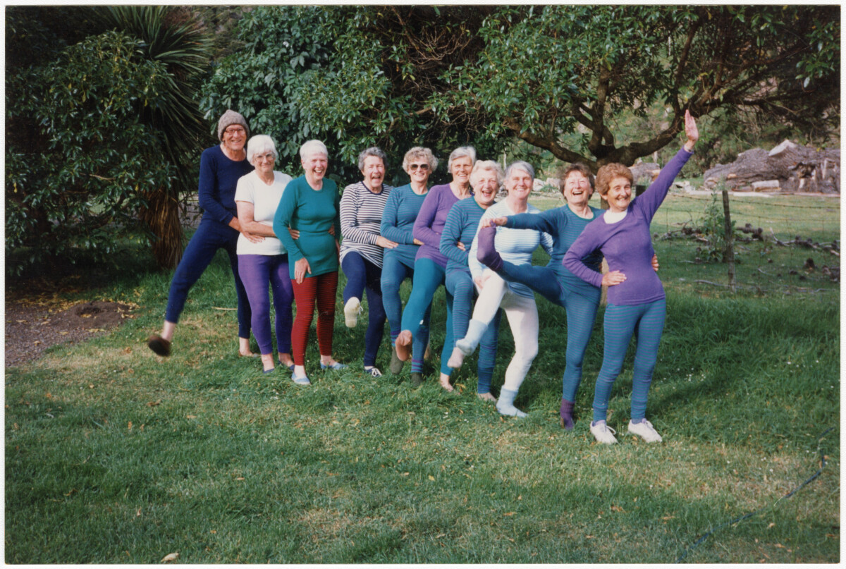 "'The polyprop line up.' Ann Marie Tweedy - a leader of walking groups in Christchurch organised the 4 day Banks Peninsula Coastal Walk for this group of oldies in November 1994. The walk was a challenge, but the scenery was well worth it. We are pictured here at Otanerito, our last stop before heading back to Akaroa." - Contributor's note