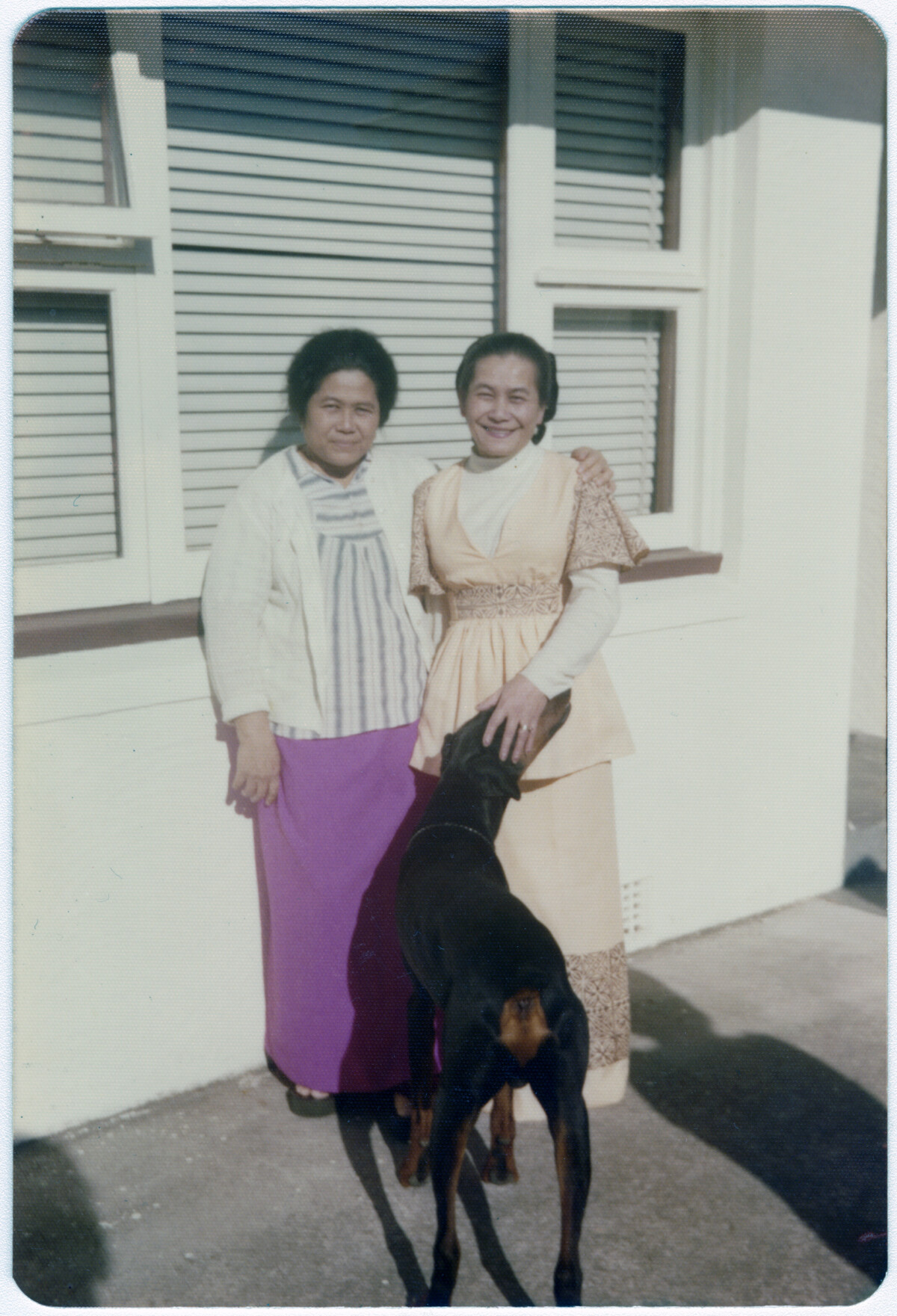 Sala Laban & Simoe Smith with Rhondo the dog on the front verandah of the Ai'ono home on Cranbrook Ave. Aunty Sala came to visit her sisters in Christchurch from Samoa.