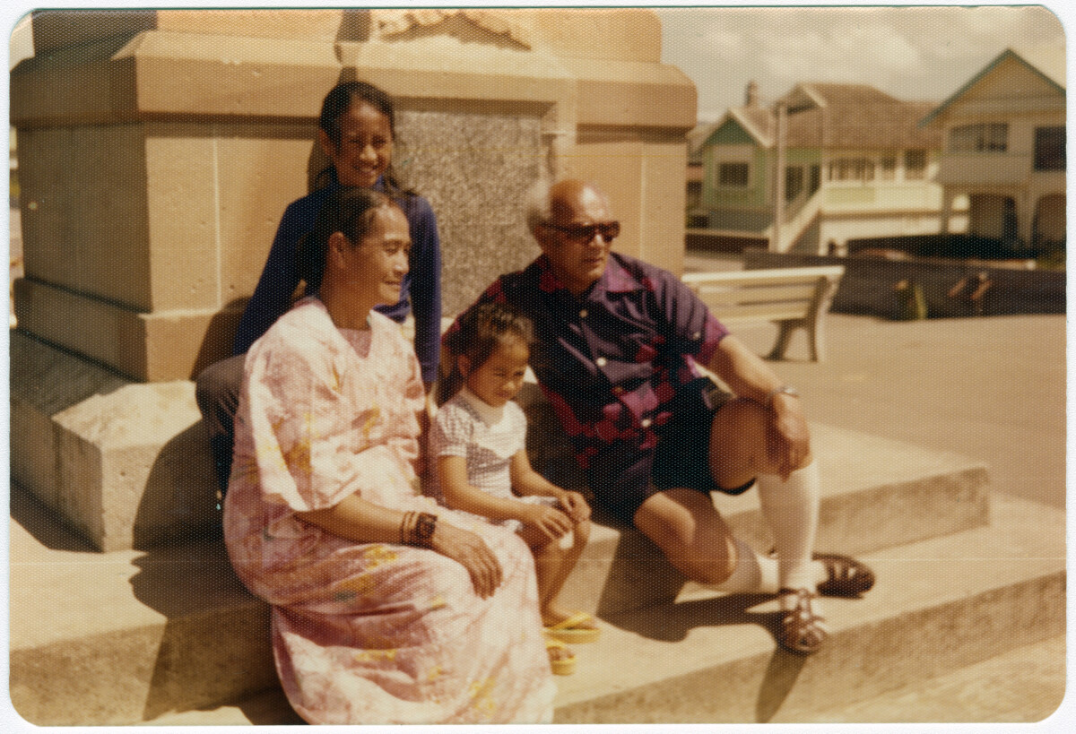The Ai'ono family sitting on the steps in front of the New Brighton War Memorial on Marine Parade. Family members are Fa'asala and Savea Malaki with daughter Saunoa and granddaughter Melany.