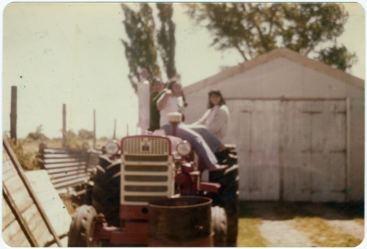 Saunoa Ai'ono, Edna Faletoese, and Sarona Ai'ono on top of the tractor at Aunty Sue and Uncle Trevors farm in Oxford.