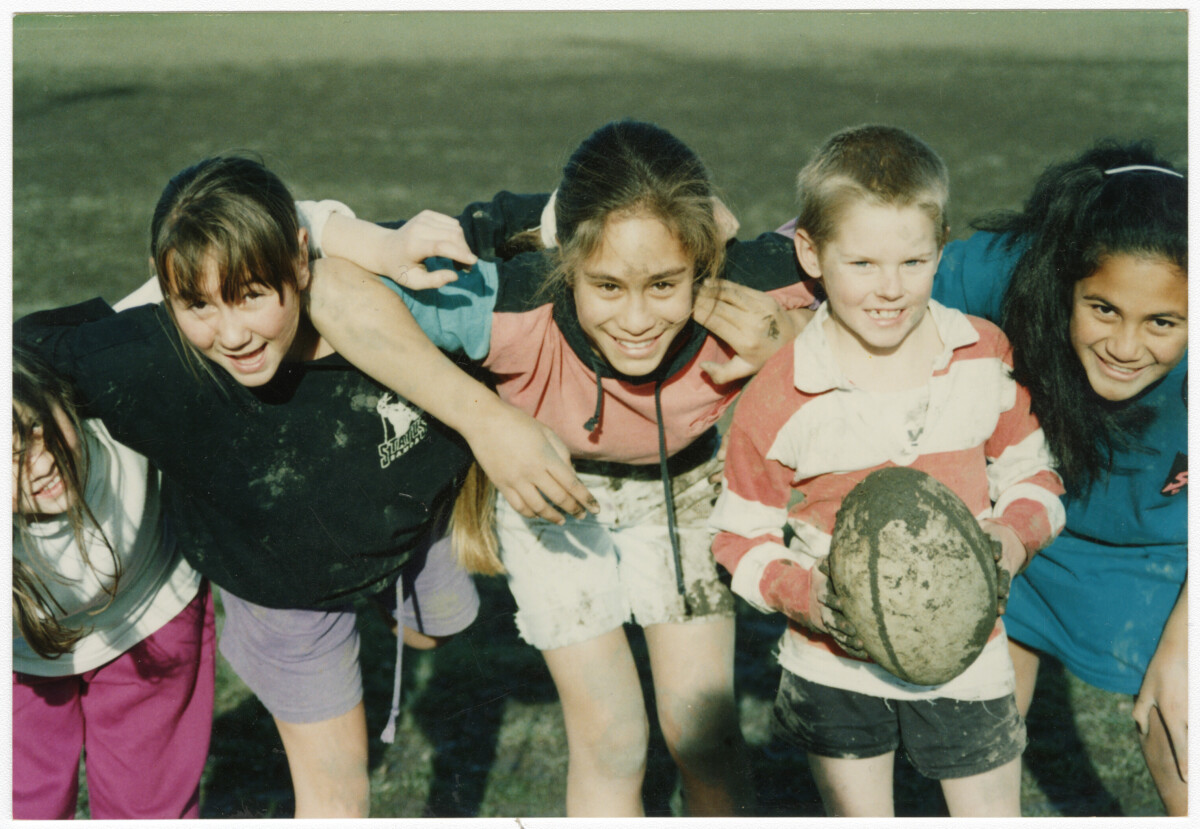 Linwood Ave Primary School Rugby Team posing for an article about girls playing rugby for a school journal. Jessie Donnelly, Katie Senior, Gemma Thomson,?, Jan-Hai Iosefa.