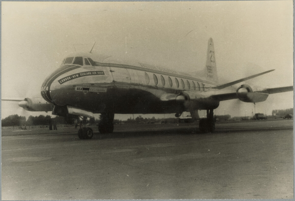 "Photo taken by Pete Basire at Christchurch airport October 1953. My late father, Peter Basire, a keen plane enthusiast and photographer came to Christchurch from Wellington for the arrival of the planes in the Last Great Air Race: London to Christchurch October 1953. Peter Basire, took many photos of this event, he took many great photos of planes including planes in the air, the several photos I selected show people; including families and children, welcomes, a plane in motion, and planes being serviced. Of no 23 the British European Airways Vickers Viscount 701, possibly in motion on the runway given it’s a slightly blurred photo, it’s propellers are moving. The photo shows the number 23 on the tail, as well as the London to New Zealand Air Race banner across it’s nose." - Contributor's note