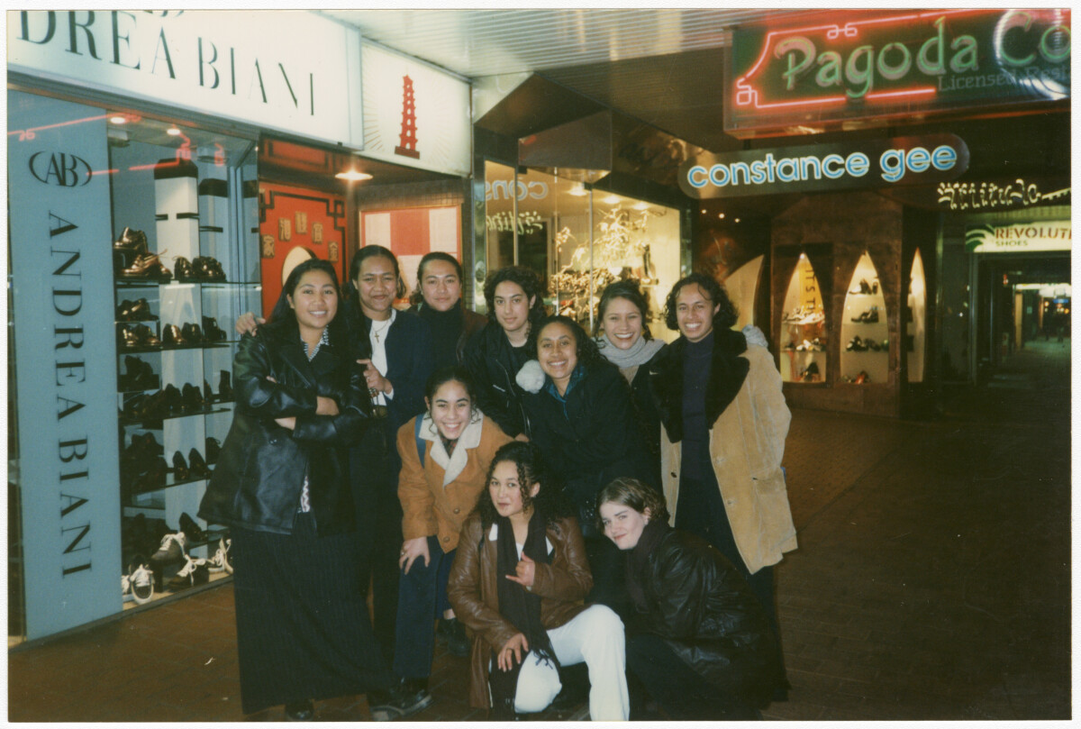 Group photo of friends after dinner at Pagoda Restaurant, Tai Sila, Ann Rees, Taele Taotua, Luaipou Puni on Colombo Street downstairs from Pagoda Restaurant.