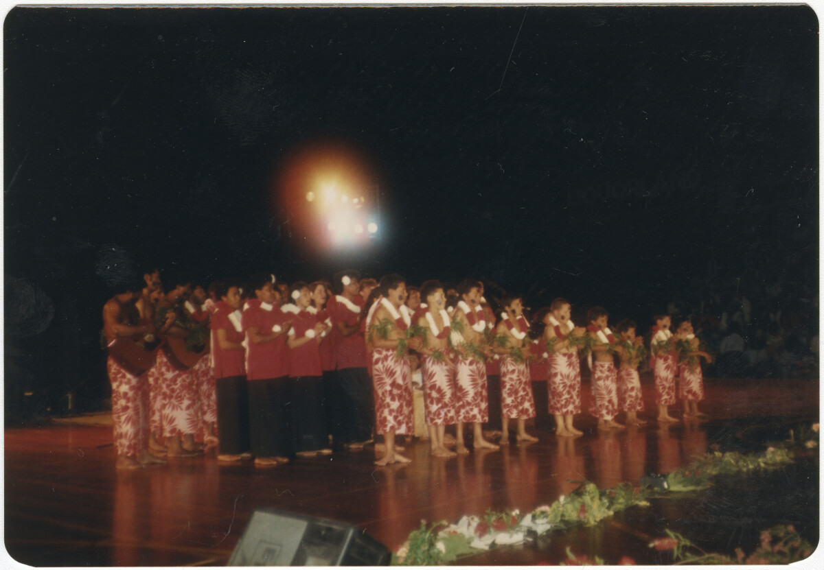 Fijian group on stage at the first South Pacific festival in Christchurch at the first South Pacific festival in Christchurch held at Cowles Stadium on Pages Road. The group was run by Tony Qalivutu, community leader at the time.