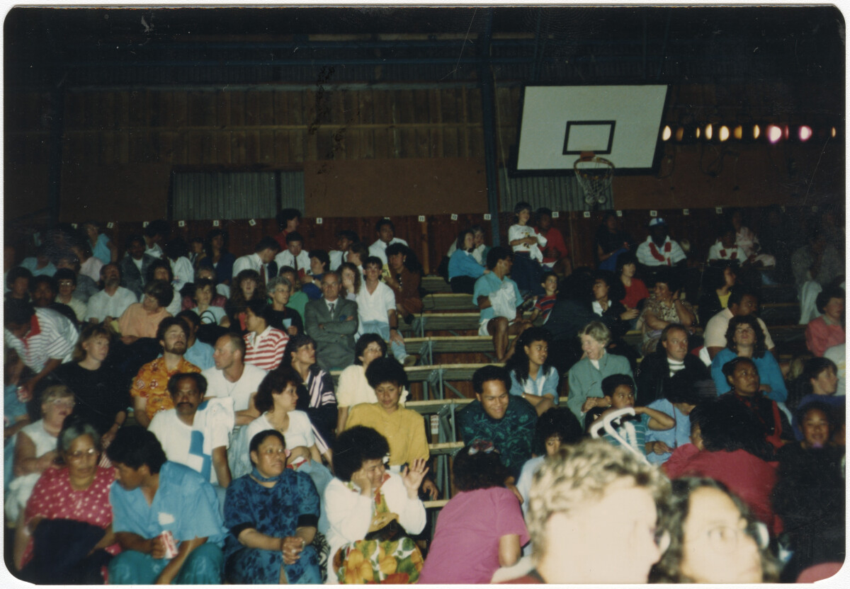 Fijian part of audience at the first South Pacific festival in Christchurch held at Cowles Stadium on Pages Road showing a full stadium.