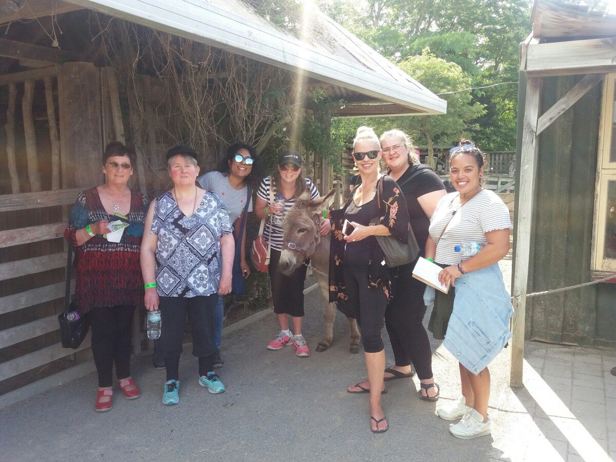 A group of volunteers and their friends with a donkey at Willowbank Wildlife Reserve in Northwood during an International Volunteer Day trip as part of the IHC Volunteer Friendship programme in Christchurch. Every year IHC celebrates all the friendships made through the volunteer programme with a meet-up event in Christchurch.