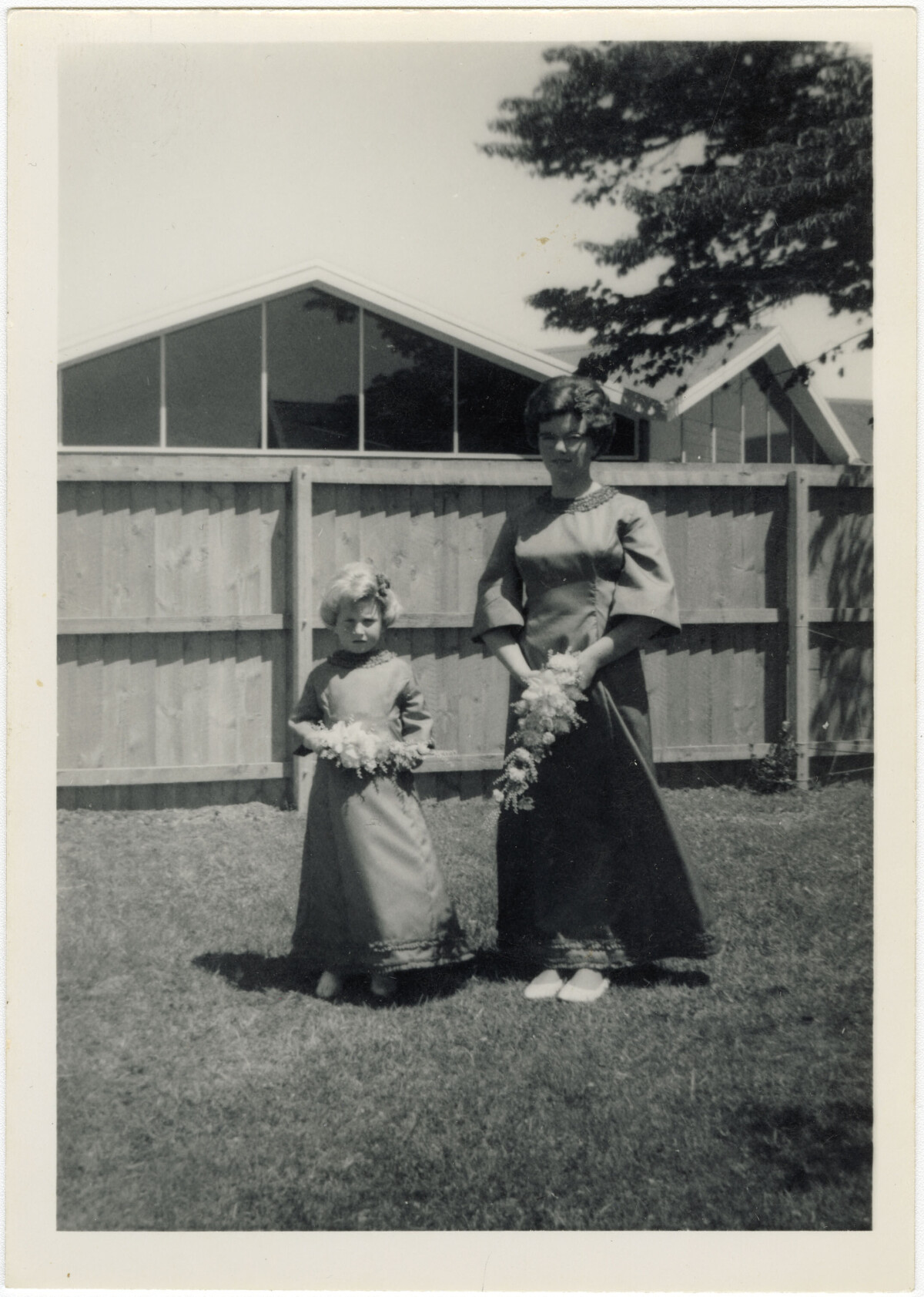 A bridesmaid and flowergirl on the wedding day of Patricia Martin on her wedding day prior to becoming Trish Burren. "Don't know who the flower girl was, the photograph was taken on the front lawn of No 339? Main North Road, Redwood. The new library is just over the fence. The house they lived in had a veranda across the front and a square bay near the driveway. The land behind the house was a big farm for cattle and cut paddocks for hay in summertime. Thought to have belonged to the White family. The house was a wooden building thought to be of sound structure and at the time of the new library being built it ws demolished, it was said that people thought it could have been used for some sort of community activities. The tree in the photograph is now a large elm growing in from of the where the house once was." - Contributor's note