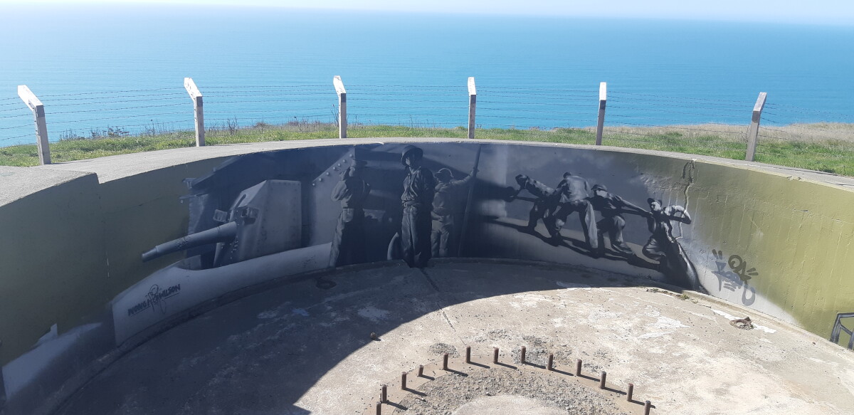 Mural featuring World War II personnel by street artist Wongi Wilson on part of the Godley Head Gun Emplacements. The art was painted to celebrate the reopening of the emplacements following earthquake damage and to discourage taggers from the site.