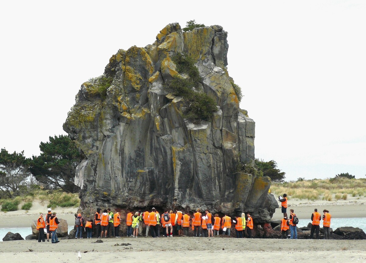 Tea rooms from Sumner beach. Groups of people are on the beach ...