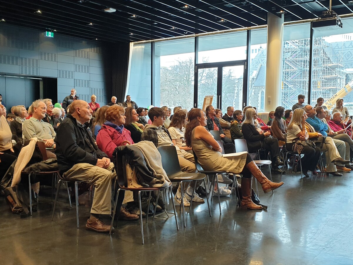 Partial view of the crowd attending the Festa della Repubblica event in the TSB Space at Tūranga. TheChristChurch Cathedral can be seen through the window.