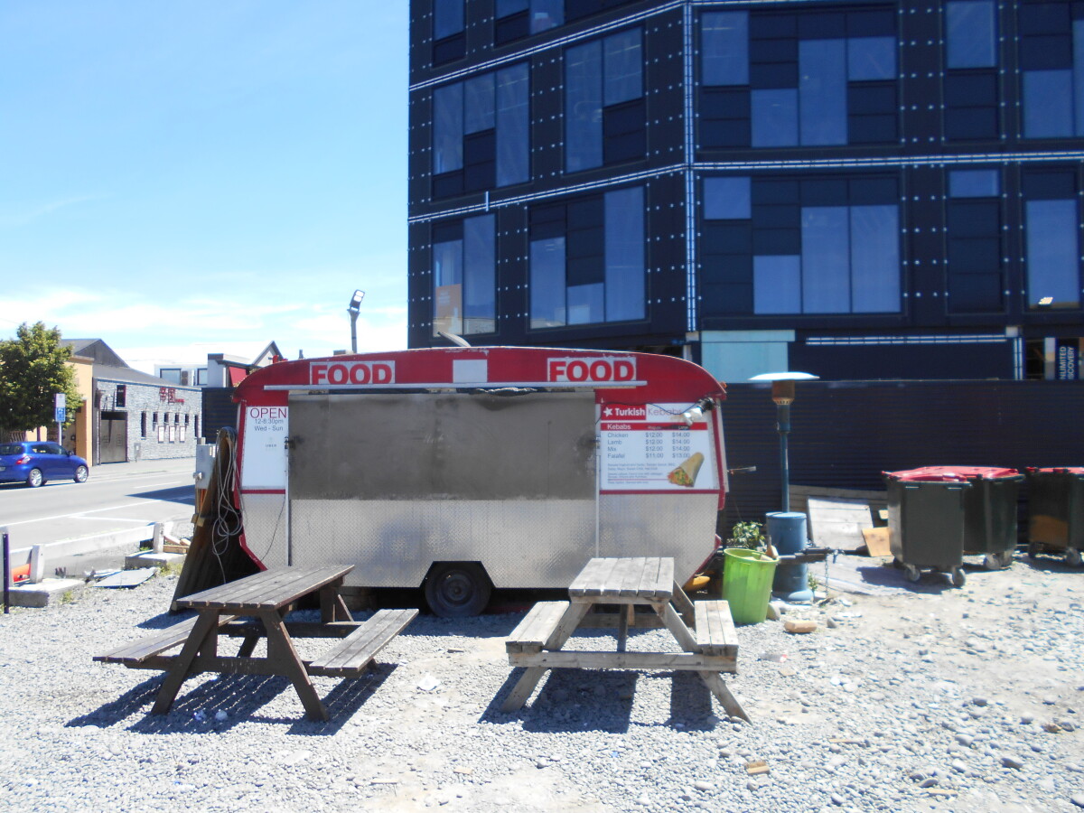 Turkish food caravan and dining area at the corner of St Asaph and Colombo Street.