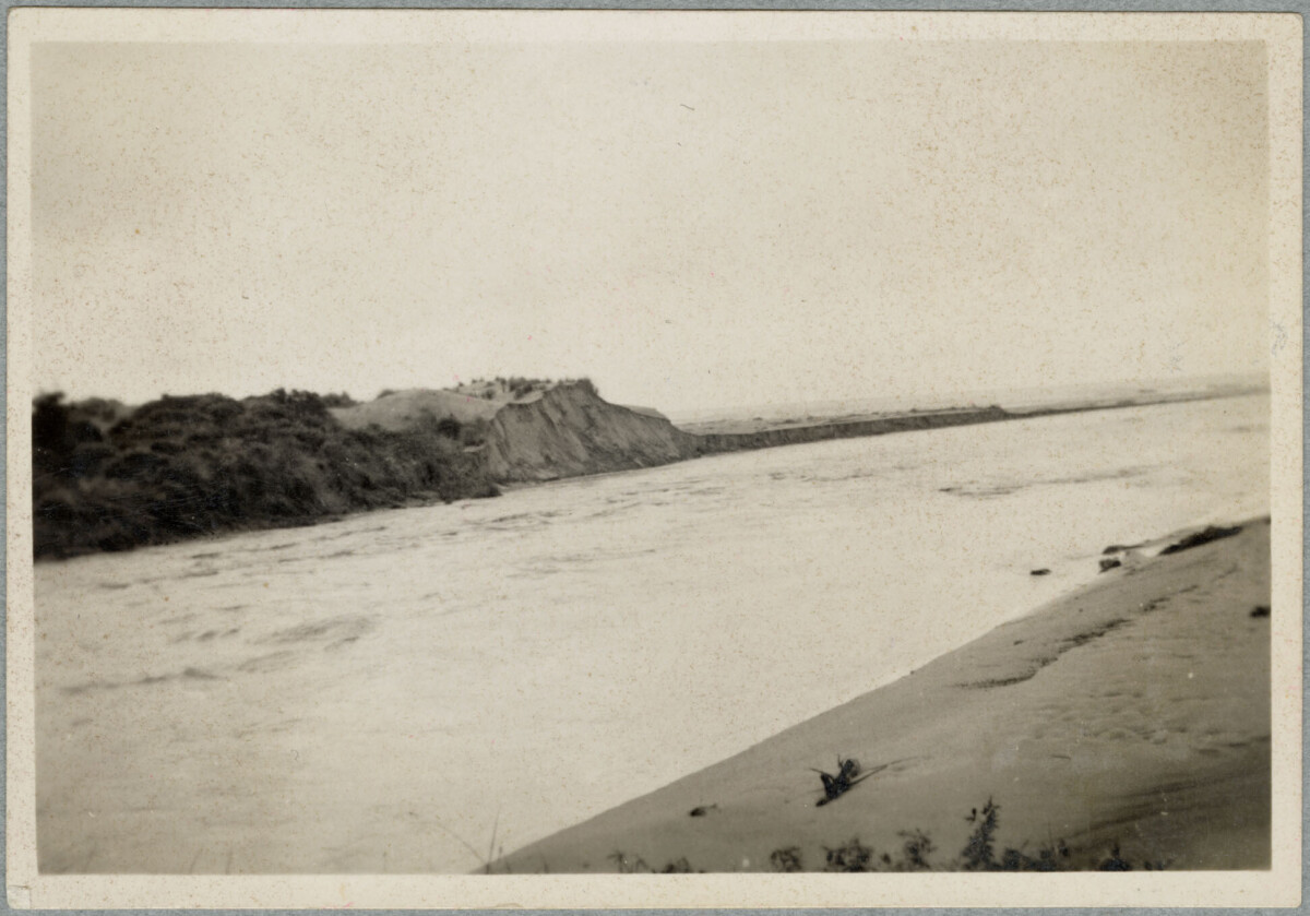 Flooded Ashley River breaks its banks and comes through Waikuku Beach, cutting through sandhills to the sea.
