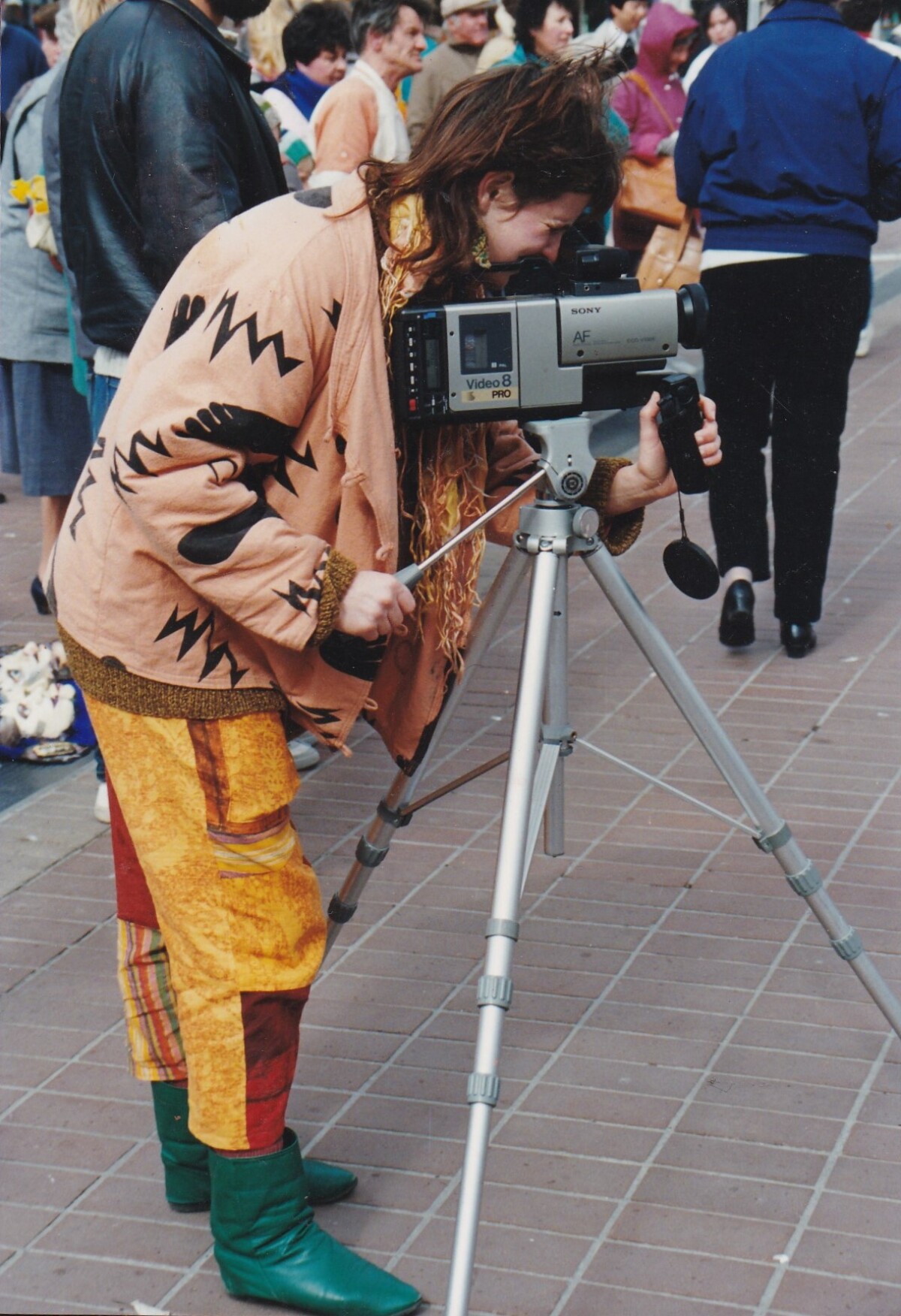 I was making a film for art school about puppetry in New Zealand. I like this photo because it was a pretty typical outfit in those days for me - everything about my look is DIY, including my haircut and colour. Eventually as my boots fell apart I tied them together with fabric and string and they also joined the collection. Back in the 1980's Christchurch was even more conservative and I got a lot of looks and comments as I cruised around town. I must have handed my camera to my friend to hold - because these photos were a surprise.