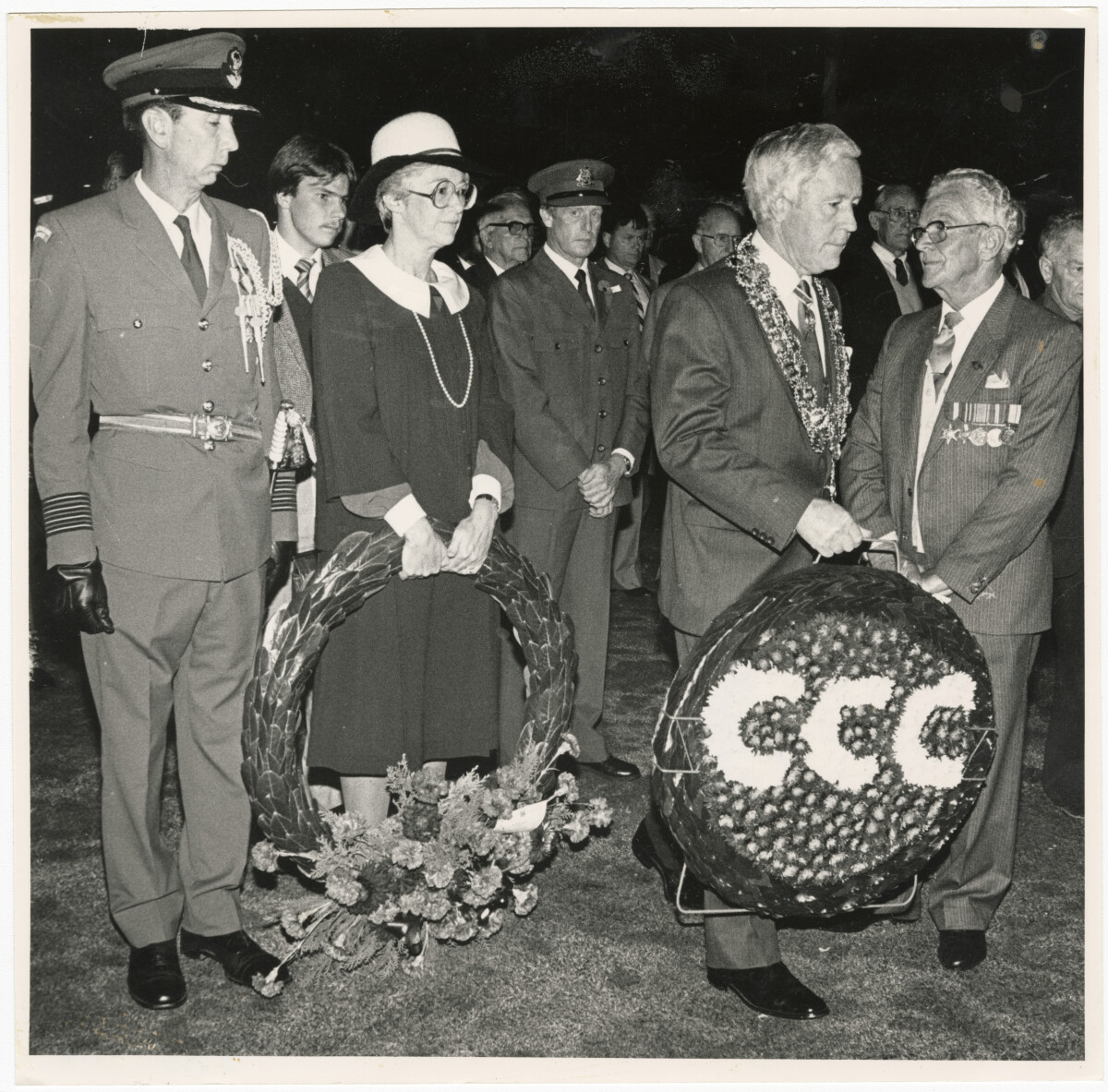 Christchurch Mayor, Hamish Hay, and Member of Parliament for Lyttelton, Ann Hercus, with wreaths at the Anzac Day dawn service in Cathedral Square.