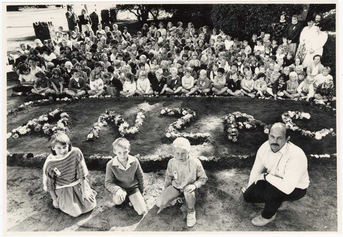Burwood Primary School pupils, from left, Nicola Beilson, Shannon Doid, Riki Moore and headmaster, Warren Hawke with an Anzac flower display. The rest of the school is seated behind.