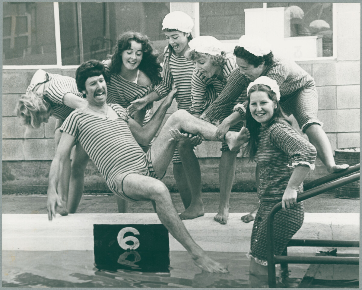 Women throwing Vern Payne into the Woolston Park Swimming Pool in period costumes.