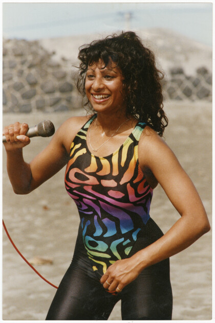 Close-up of Uma Bhana with a microphone leading an aerobics ...