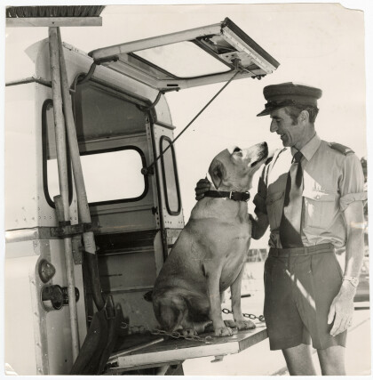 Jim Diack, beach patrolman, with a golden labrador sitting in ...