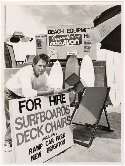 Tony Smoor with beach equipment for hire at New Brighton.