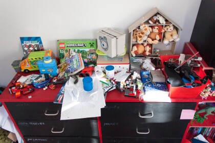Close-up of a child's desk with toys, including Lego, in a house ...