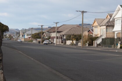 View along Marine Parade in New Brighton towards the Port Hills. ...