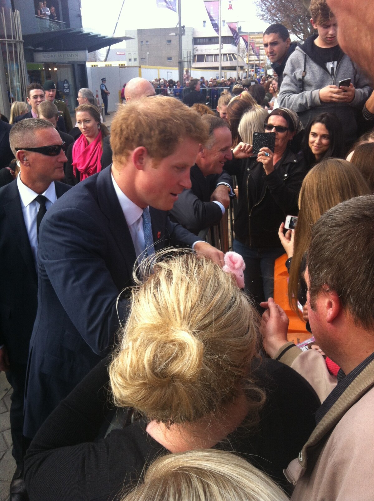Prince Harry and John Key greeting crowds in Cashel Street during a royal visit.