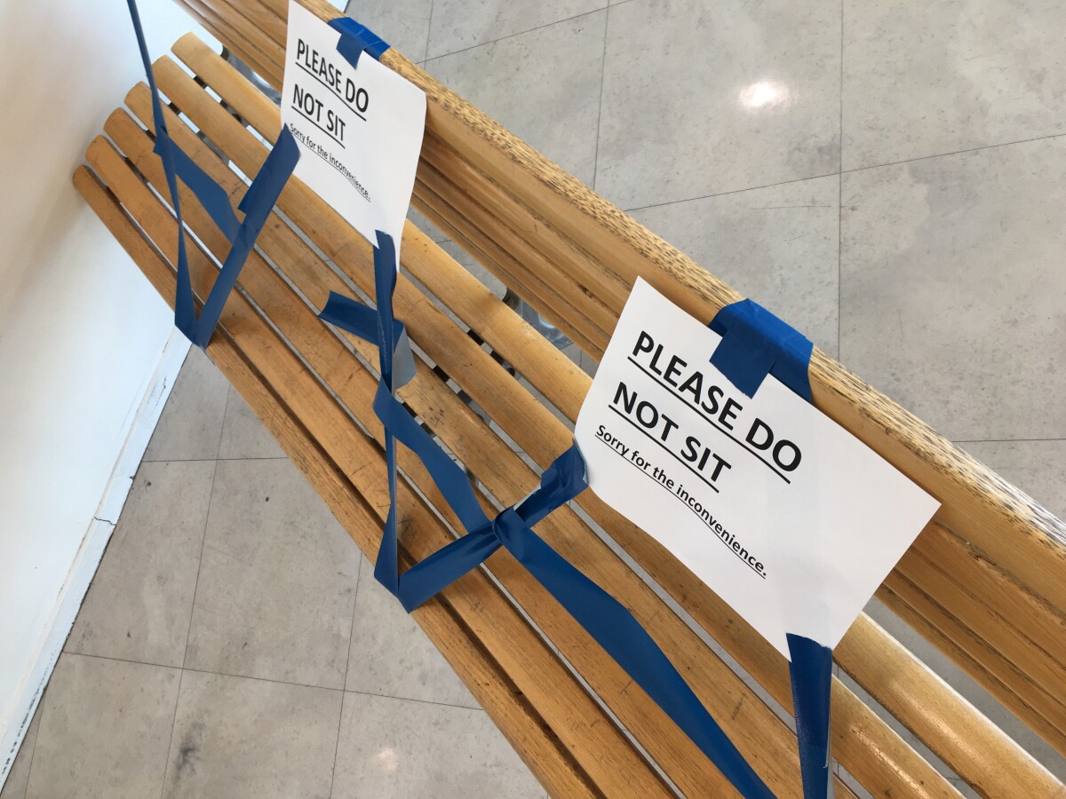 Bench seating in use as a barricade to keep people from entering the mall proper. Tape has been put across the seats and paper signs that say "PLEASE DO NOT SIT / Sorry for the inconvenience."